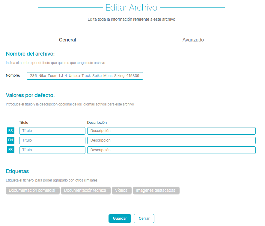 Está sección nos permite introducir los archivos multimedia, imágenes (jpg, gif, png) o vídeos (mp4), que hacen referencia al producto
