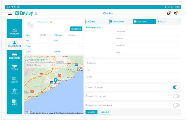 En la primera vista podemos ver, el listado de clientes ordenados alfabeticamente, junto a un mapa con la localizacion de los clientes.